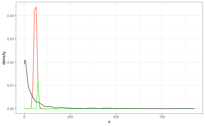 Great, both functions are exactly the same. But when I now try to add the density function of the data, things get messed up: