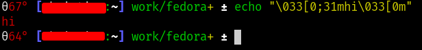 Regarding the title of this thread –> \033[0;31m start’s to colorize your output red. Please be aware that you must reset your sequence with \033[0m.