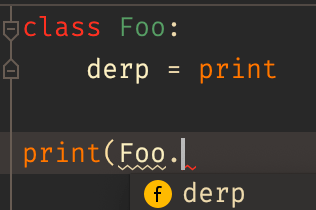 shows Foo.derp to be a field (which it is), but the value is definitely callable (since it is just print after all), and print(Foo.derp) will print <built-in function print>.
