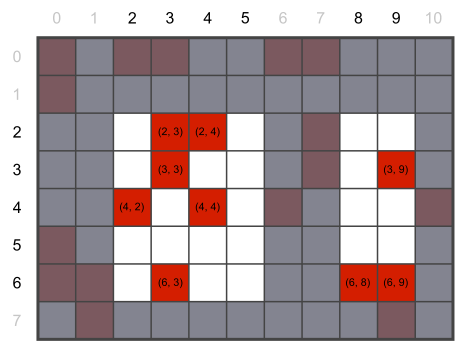 (4, 6), (4, 10), (5, 0), (6, 0), (6, 1), (7, 1), (7, 9)