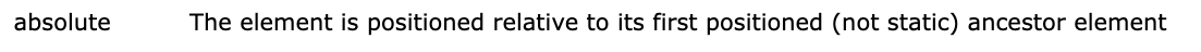 The element is removed from the normal document flow, and no space is created for the element in the page layout. It is positioned relative to its closest positioned ancestor, if any; otherwise, it is placed relative to the initial containing block.