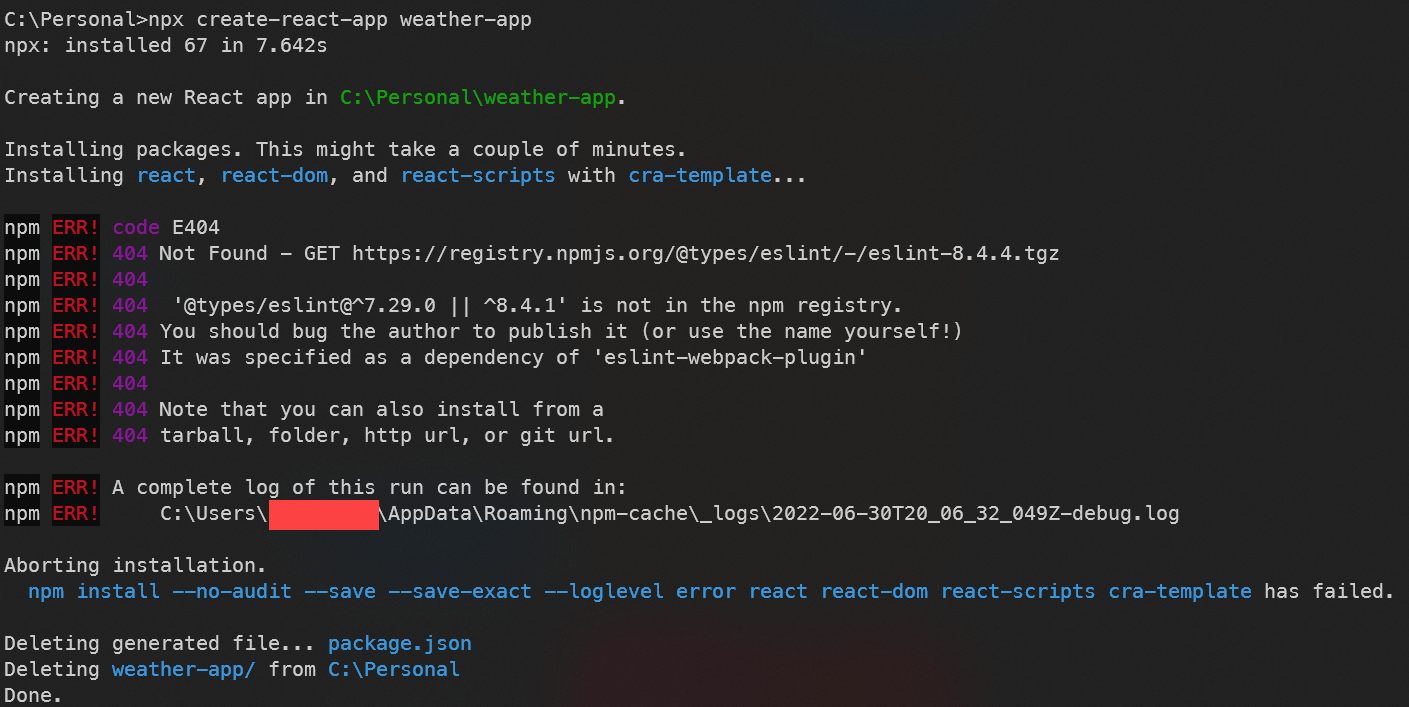 I jumped on to run npx create-react-app, however, the output of this is that there is no eslint-8.4.4 found on the npmregistry, looking online they just released 8.4.4 I believe?