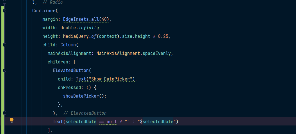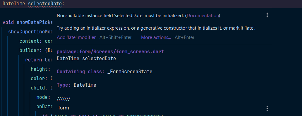 When I add date picker then show ‘Non-nullable instance field ‘selectedDate’ must be initialized. ‘ error