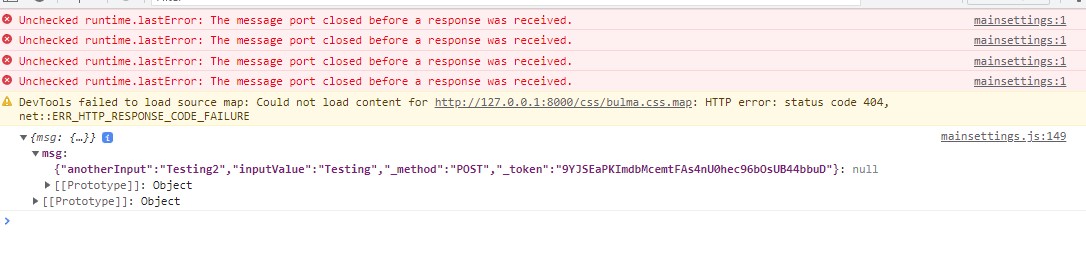 In this case, you were encoding your data object as a single String, and sending that to the controller. $request->all() was using that JSON string as an Array index, hence the weird ['{"anotherInput":"Testing2", ...}' => null] output when logging via \Log::info($request->all());