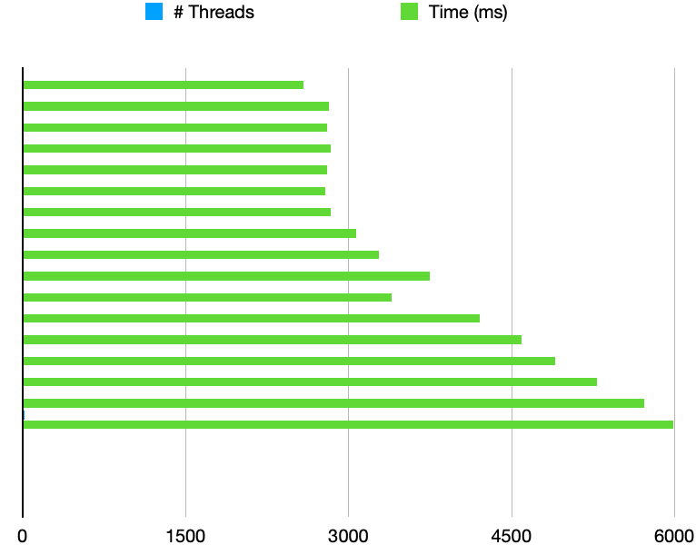 I’ve set up a program to measure the time it takes for a thread to perform a certain operation (see below for more details). My MacBook has 4 physical or 8 logical cores (hyper threading available), so I’d assume I could run up to 8 threads in parallel.