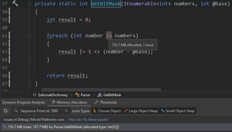 As you can see: it has literally no direct allocations, but whatever you pass in as numbers has 4 opportunities to do anything it chooses: GetEnumerator(), MoveNext(), Current, and Dispose(). We can’t tell you what the input numbers is, but there’s a good chance that the tool is measuring these invisible allocations and attributing them to the foreach.