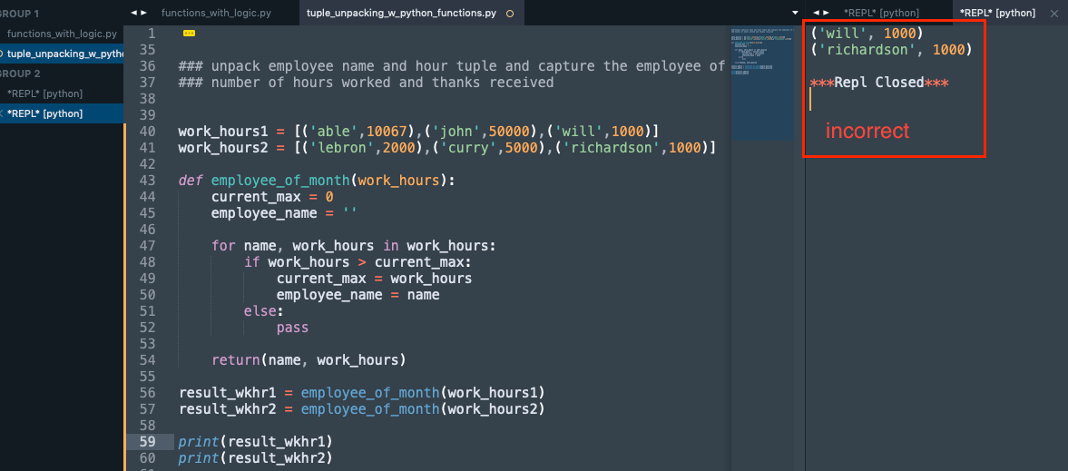 I wanted to know why my code is outputting the last tuple item in my tuple list [work hours] instead of the max hours/employee of the month, I am a noob in Python and I am stuck in this problem within my Python curriculum?