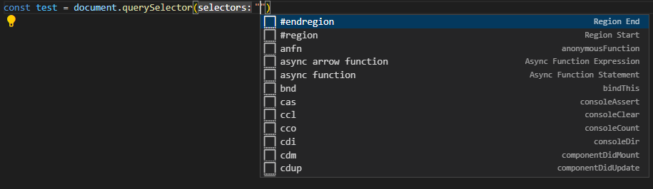 I’m not sure why snippets appear in this context when triggering suggestions manually but not when opening the string argument to document.querySelector. There is the possibility of it being a bug. Ex. User Snippets not showing up in quickSuggestions #19244. If you choose to raise a bug report to the VS Code team (actually, I’d encourage you to do so- just to see if it’s by-design or not), please do comment here with a link to it so I can track it as well.