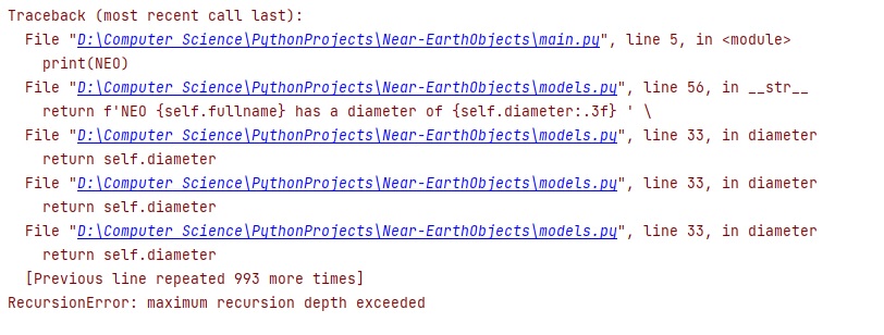 when it tries to determine the value of object.diameter it will run the diameter(self) function which then tries to determine the value of the self.diameter which again invokes the diameter(self) function, which tries to determine the value of self.diameter, etc etc until you reach recursion limit