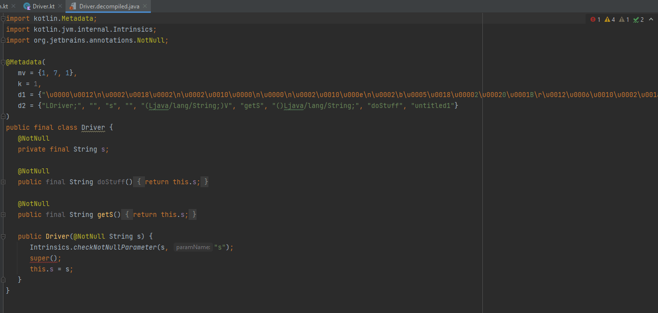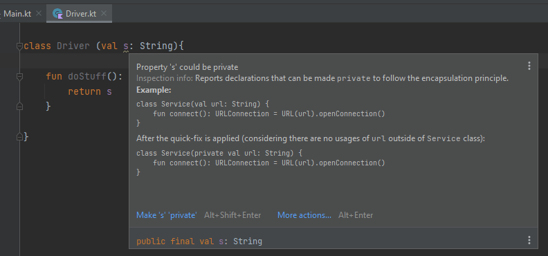 If you changed val s to private val s, the decompiled class would have private visibility for the getS() accessor rather than public.