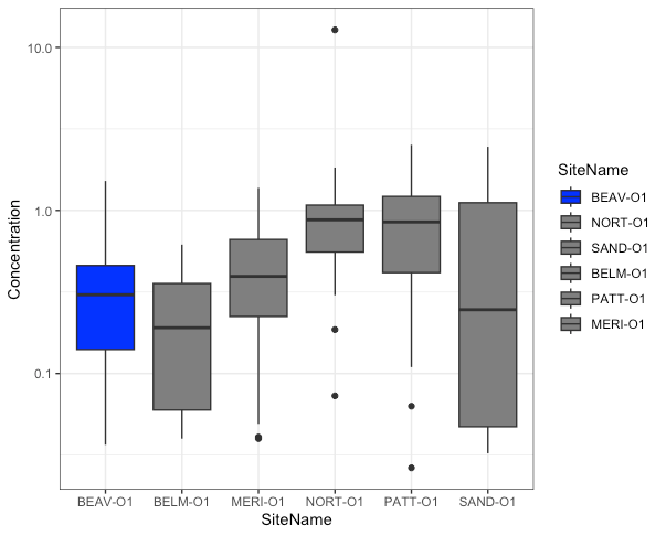 `ggplot(Boxplots, aes(x=SiteName, y= Concentration, fill=SiteName)) + geom_boxplot() + scale_y_log10() + theme_bw() + scale_fill_manual(breaks= Boxplots$SiteName, values= c("blue", "cornflowerblue","cyan", "red", "darkred", "maroon"))