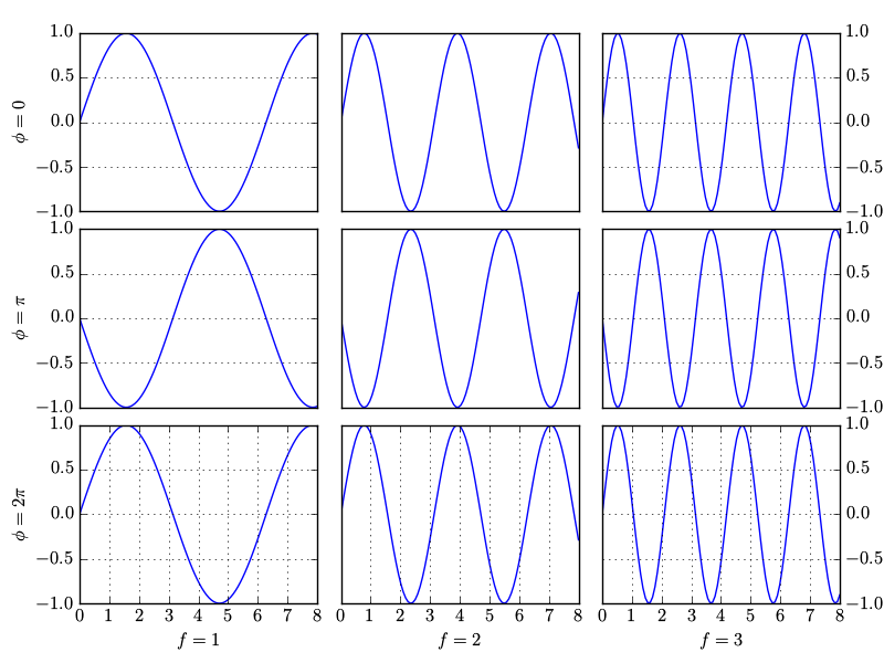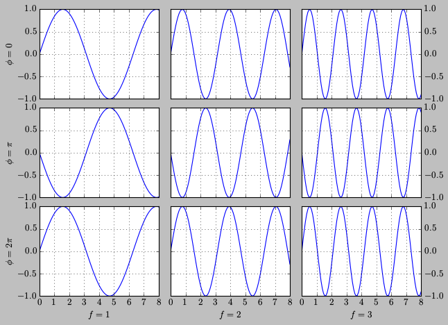 ax[i,j].plot(x, numpy.sin((1+j)*x+numpy.pi*i), )