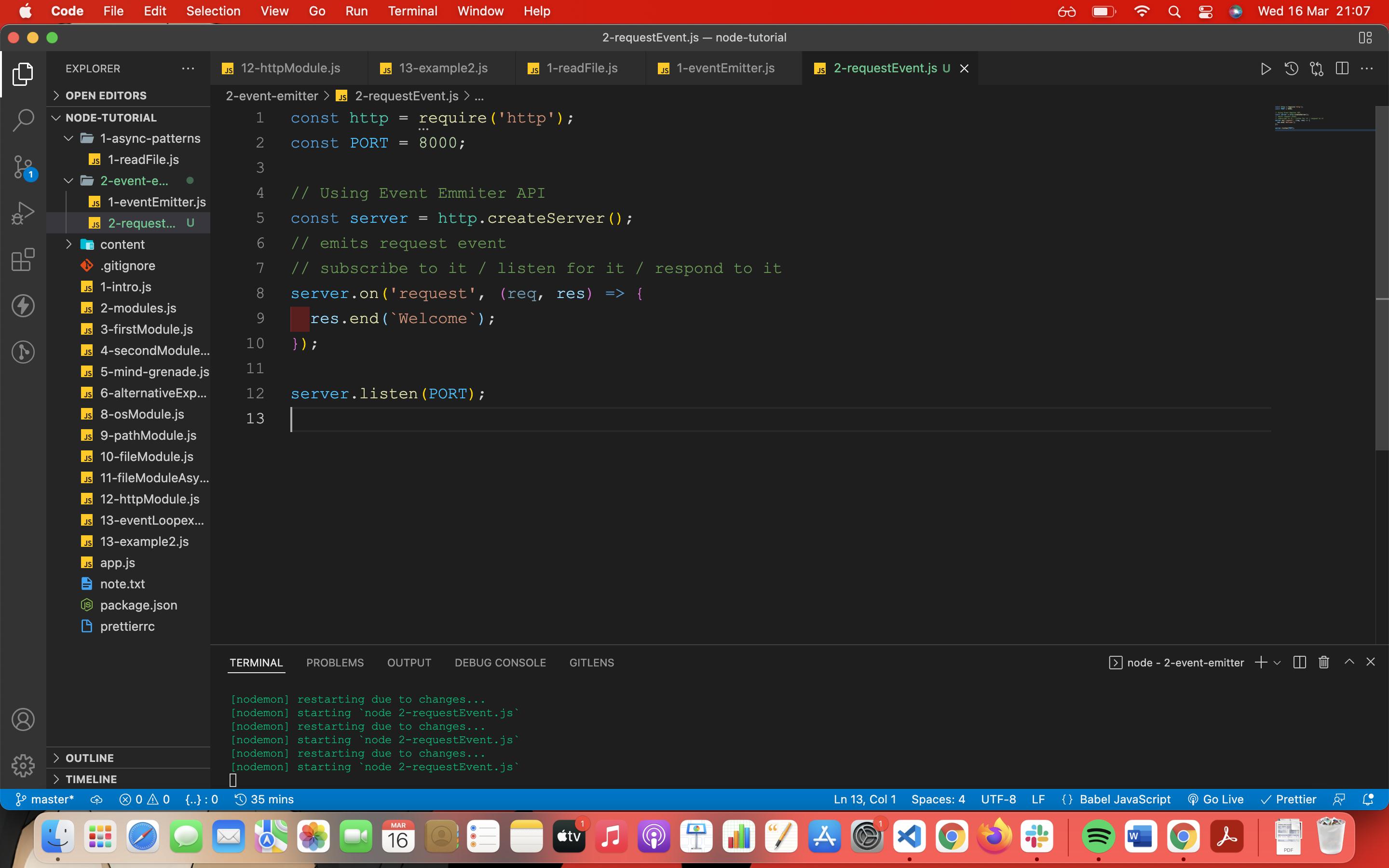 There is no .emit() because that’s not how the http server object works. Internally, it uses .emit() to create events that listeners can get notified about, but when you are listening for an event, you don’t use .emit() yourself. Instead, you use the data that comes with the event to act appropriately for that particular event. In this case, you use the request and response objects which are sent with the request event.