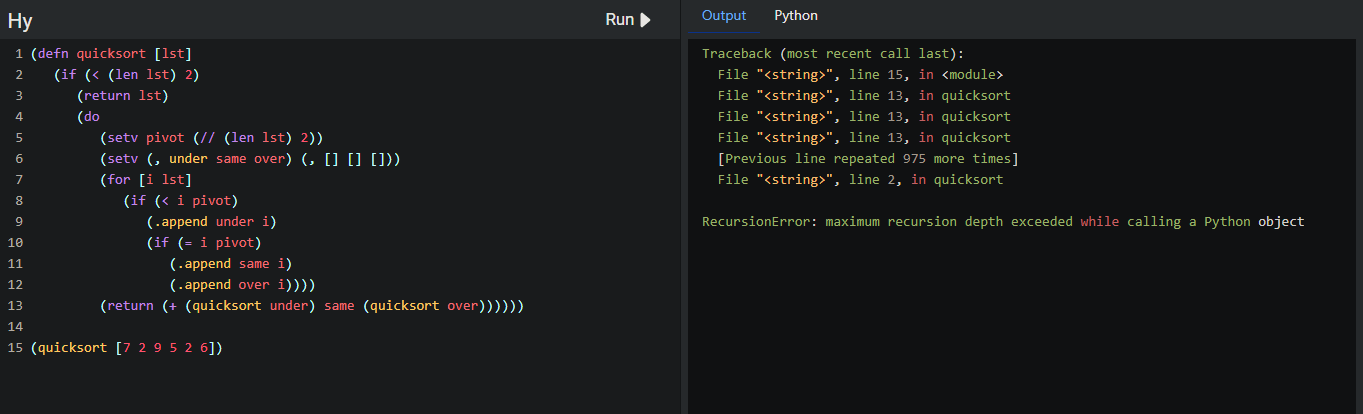 However, the Hy function throws the following error: (demonstrated in the online Hy interpreter)