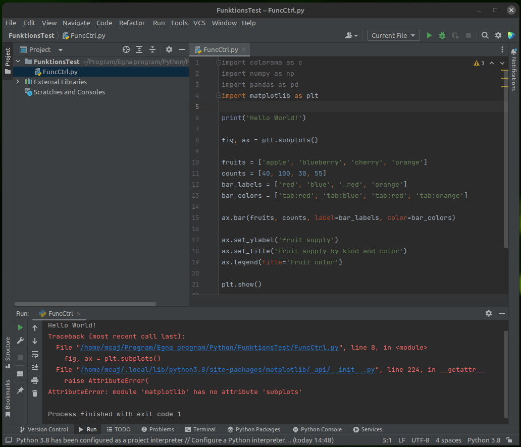 I have a python-script that is meant to test the functionality of matplotlib (among others). The script is working in terminal and Python console, but not in saved files executed from PyCharm (Linux) or Visual Studio Code (Windows). I do get the same error message for both environments about subplots missing, se screen dump: