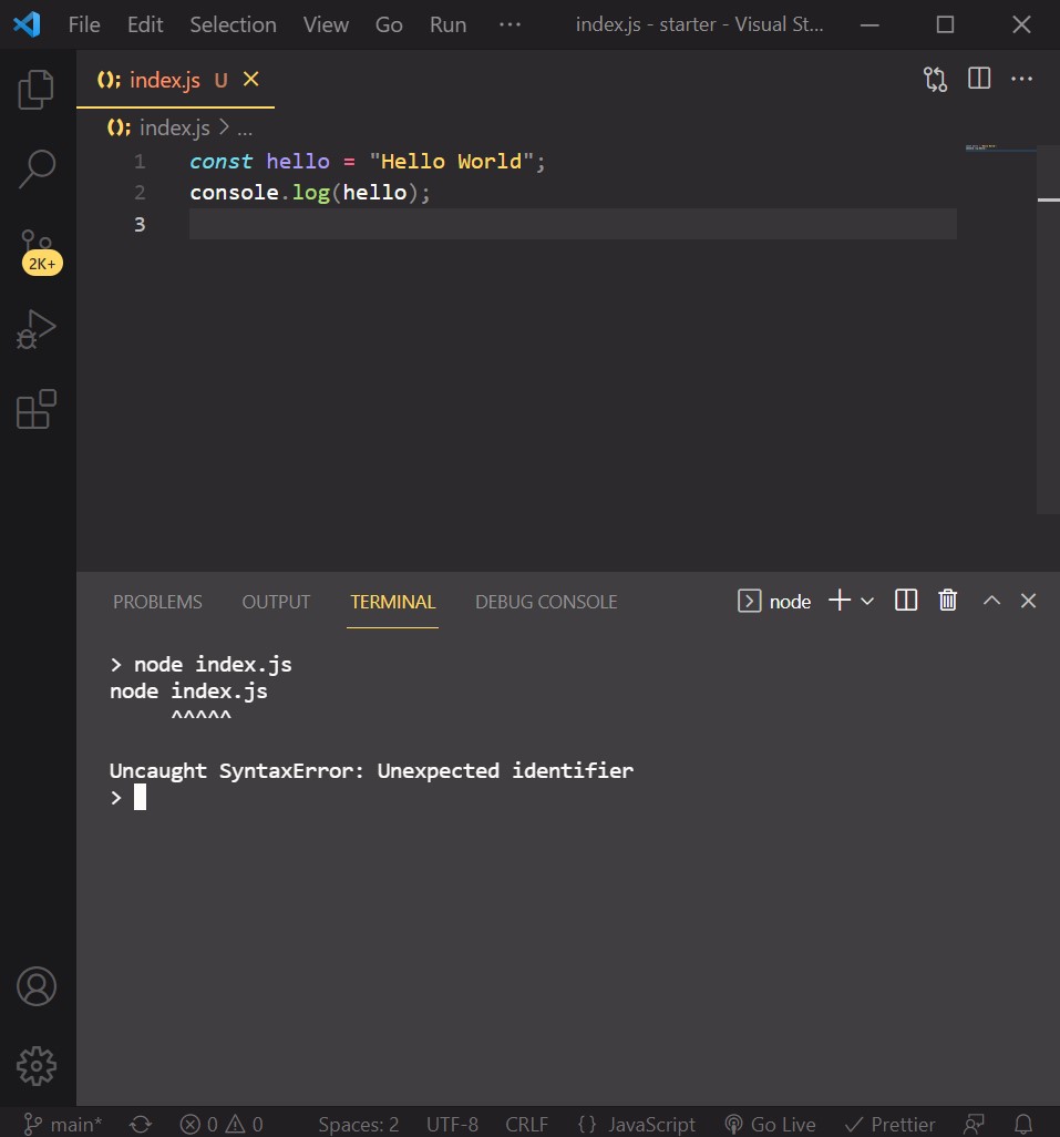 Right now, what’s happening is you’re telling Node to run the following JavaScript: