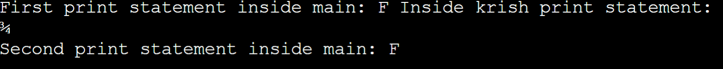I am calculating this java programme output…Here for first print statement….I get F….and after calling krinsh(c) metod….I get char c=190….According to ascII 190 represents 3/4…..and as c was declared as static its value should change to 190 and retain its value……so for second print statement I should get 3/4…..But when I execute the program I get F for both Print statement…..I tried to print c inside krish method but then I get 3/4……why am I not getting c=3/4 in the second print statement inside main method.