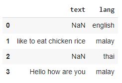 Firstly, I use FasText for language detection. Then, from the language detection, I want to translate from certain language (in this case, Malay) to English. For the translation part, I use Google Translate API using Python. The problem is, the output return NaN value for other language (in this case, English and Thai). I want to return only the translated text only, which is Malay.