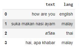 'text': ["how are you", "suka makan nasi ayam", "สวัสด","hai, apa khabar"],