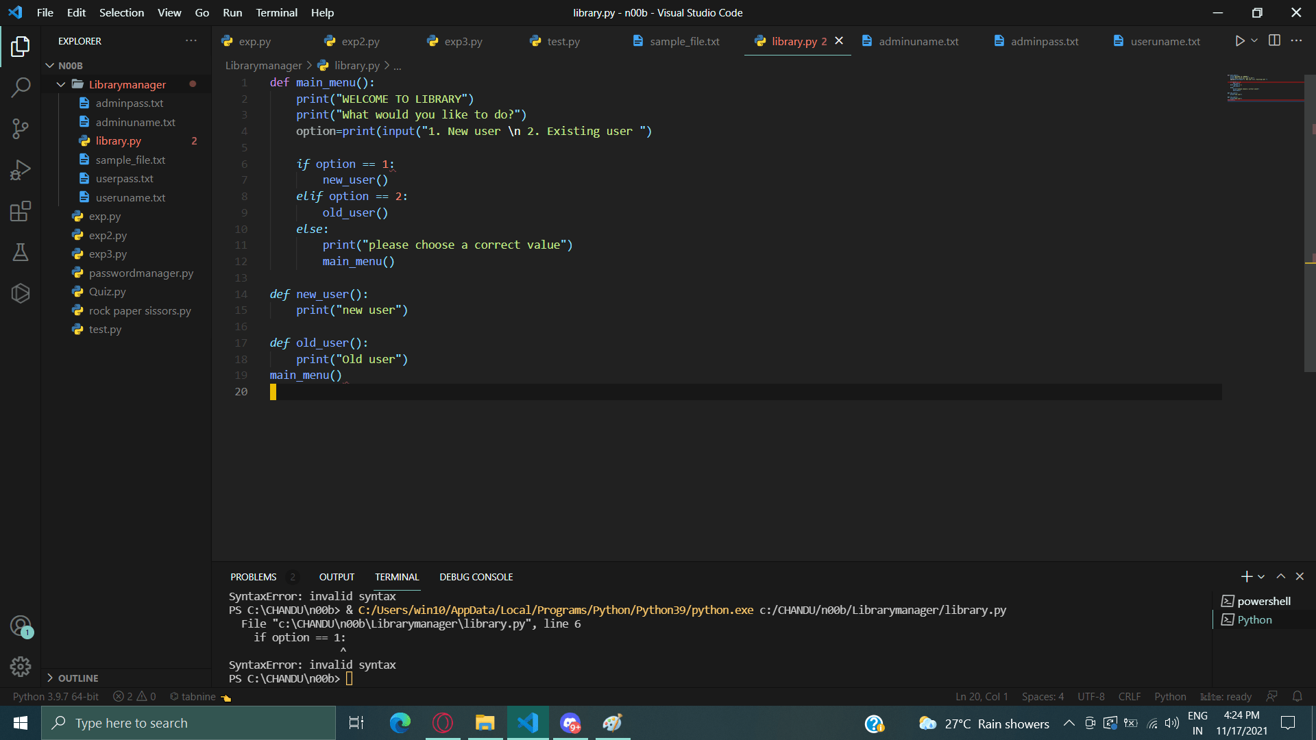 Here is a picture of the error, it says syntax error missing ")" for function call and missing "else" for the first one at "if":