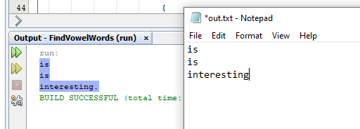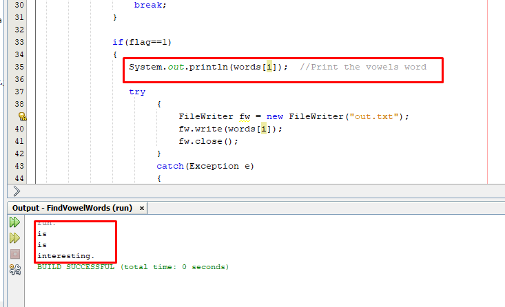 I wanted to write a java program that will copy all the words starting with a vowel from a file and store those words in another file separated by spaces to out.txt file. my code working only for the last word from the loop.