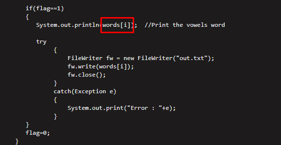 I have to transfer the words from words[I] to a global string variable and then I have to input the string to fw.write(Here);.