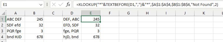 =XLOOKUP("*"&TEXTBEFORE(D1,",")&"*",$A$1:$A$4,$B$1:$B$4,"Not Found",2)